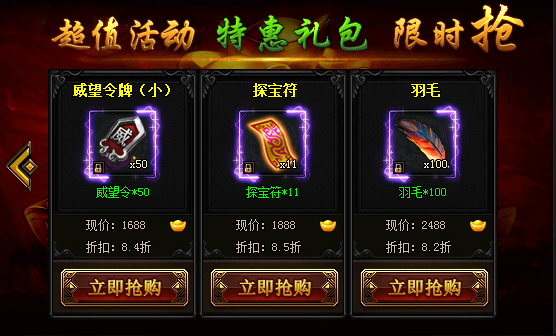 活动期间,可购买超优折扣每日限购礼包,探宝符、魂玉结晶、护盾结晶、羽毛、魂石精华、威望令牌等极品道具仅限活动期间跳楼优惠!