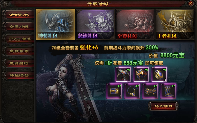 至尊礼包8888宝石碎片(大)*5、符石碎片(大)*10、神魂石(大)*3、超级BOSS召唤令*1