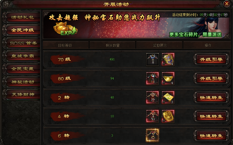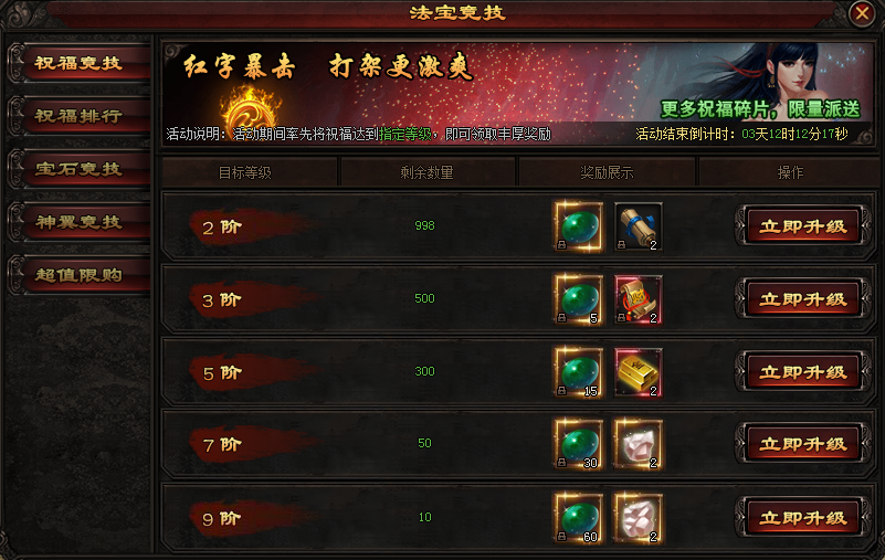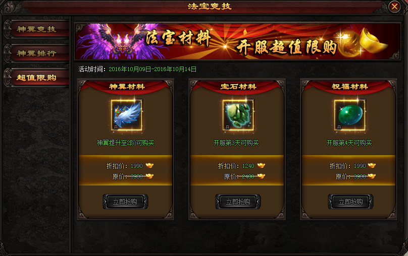 活动介绍:活动期间,提升神翼等级、宝石等级和祝福等级可分别购买不同数量的道具。