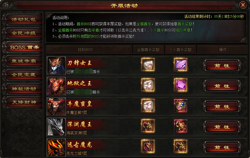 活动介绍:活动期间,首杀BOSS即可获得丰厚奖励,如果是全服首杀,更可独享首杀奖励。