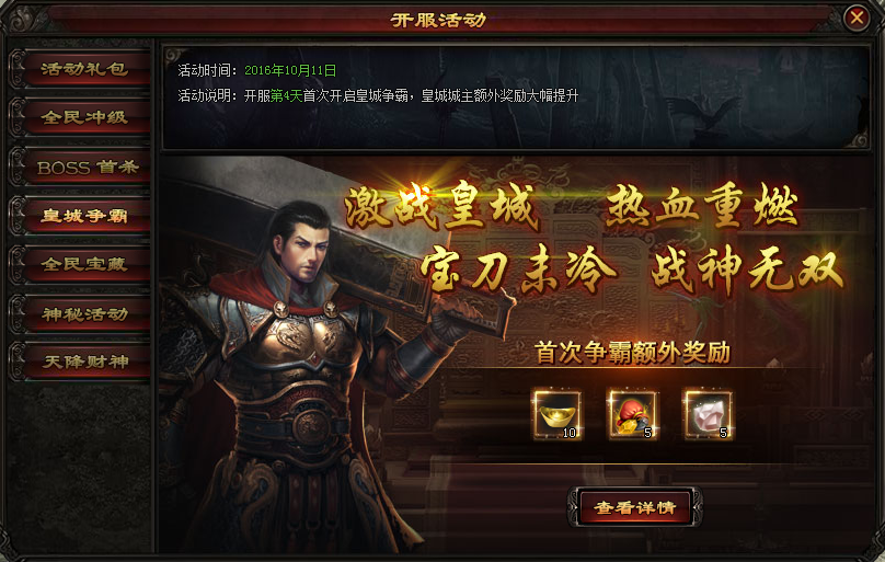 活动介绍:开服第4天首次开启皇城争霸,皇城城主哦外奖励大幅提升