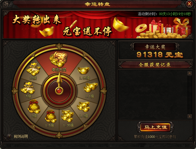 Ø 累计充值元宝达到一定额度,可获得转盘投注次数,最多可投注四次