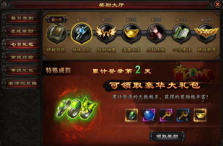 第二天特殊戒指各职业特戒*1、坐骑经验丹*5、青铜钥匙*1、檀木钥匙*5、500绑定元宝*1