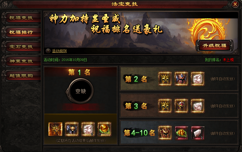 活动内容:活动时间内,玩家参与祝福等级排名,活动结束后,排名前10的玩家可获得奖励!