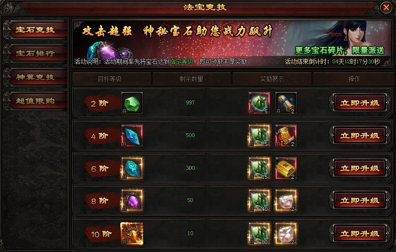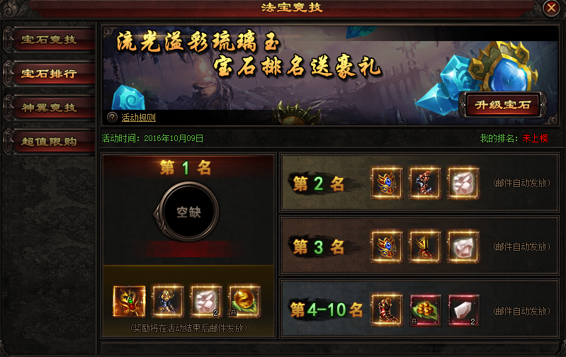 活动内容:活动时间内,玩家参与宝石等级排名,活动结束后,排名前10的玩家可获得奖励!