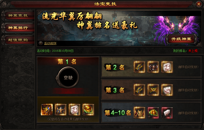 活动内容:活动时间内,玩家参与神翼等级排名,活动结束后,排名前10的玩家可获得奖励!