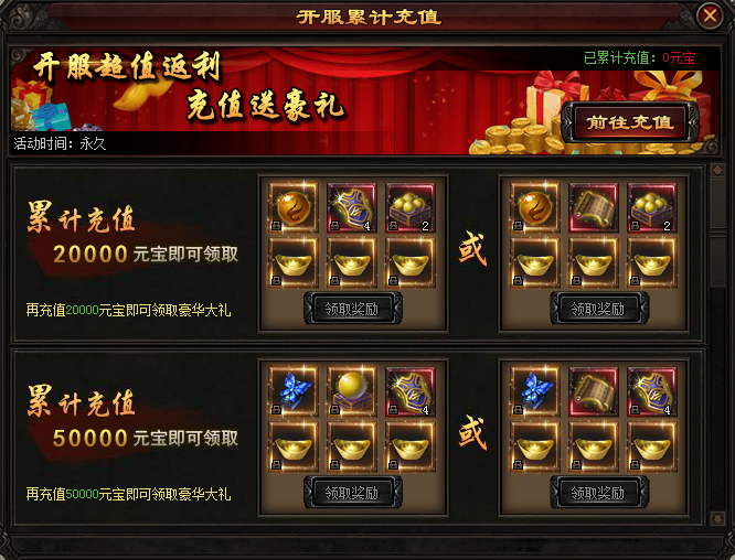 Ø 玩家累计充值达到指定元宝,即可领取对应的累计充值奖励,奖励可由玩家自由选择,每种档次2种奖励可选,物超所值!