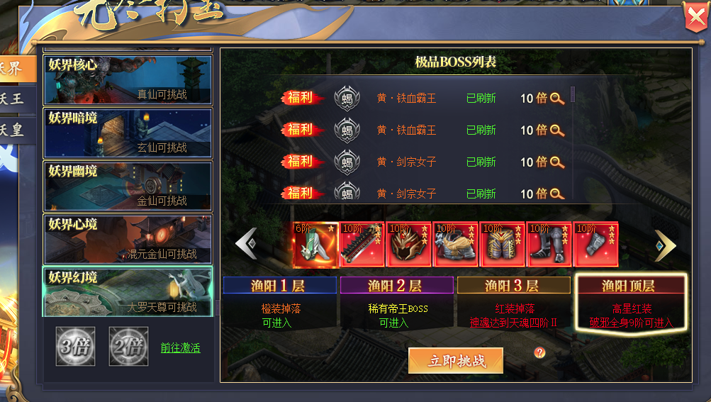 征战妖界入口在正上方,一共分为5个幻境,每个幻境有4层,进入每层都有条件需求