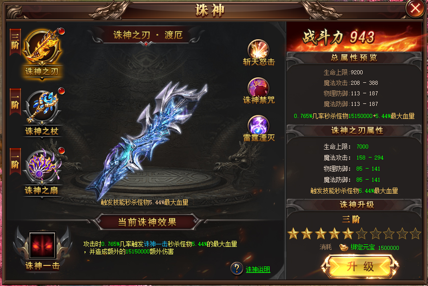 消耗元宝提升诛神星级,可提供属性加成和诸神一击伤害效果