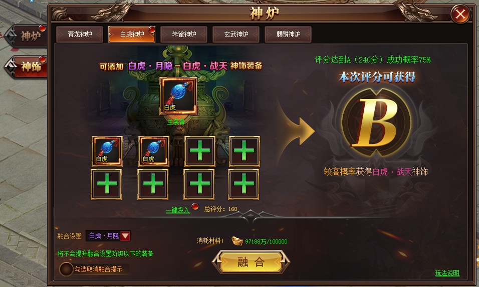 •神炉划分装备阶级,只有在阶级范围内的装备才能融合,融合需要消耗装备、货币或材料