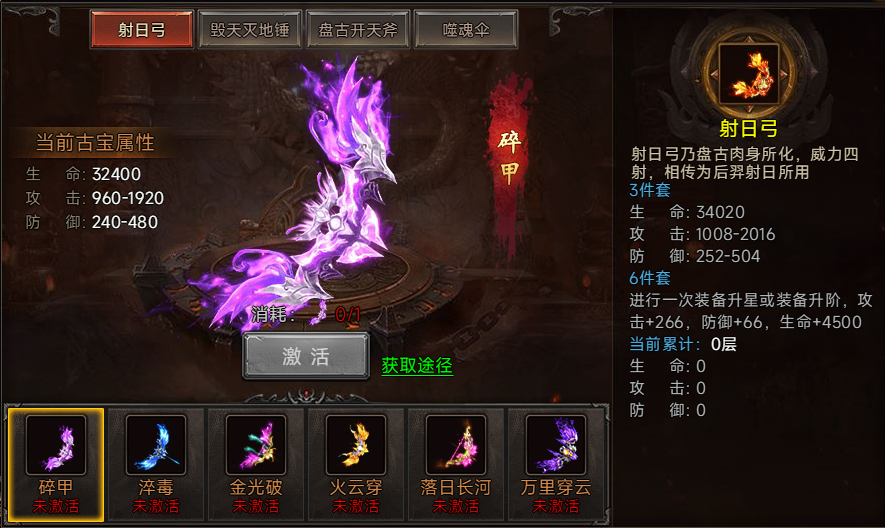 1. 玩家可以进入地图击杀BOSS,获得古宝,激活一套古宝可以获得成长属性