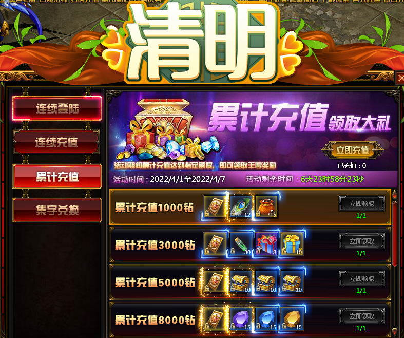 活动内容:玩家在活动时间内,累计充值达到一定钻石即可获得丰厚礼品!