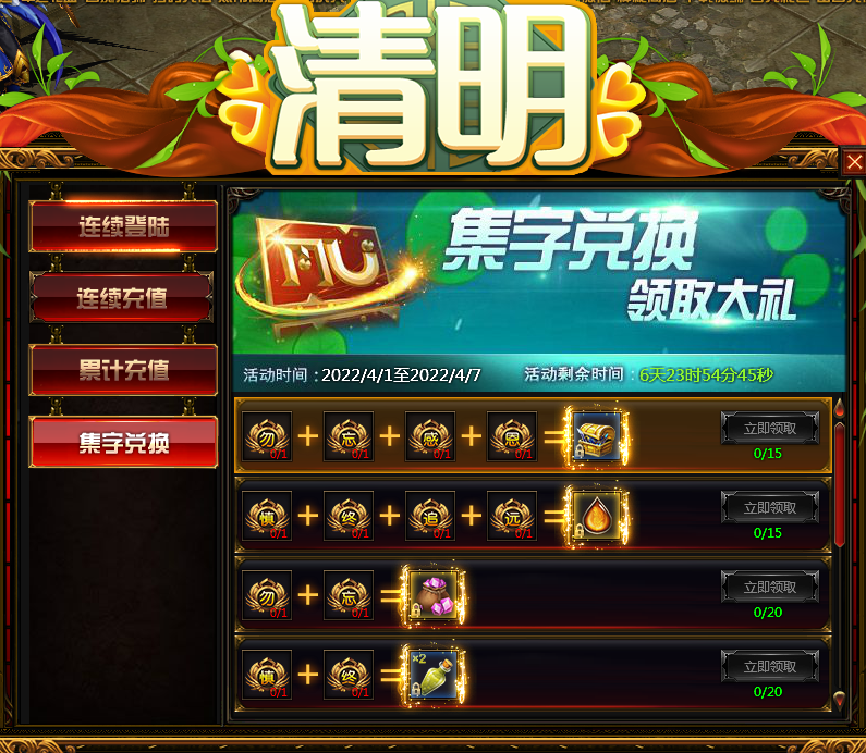 活动内容:活动时间内,玩家可以通过野怪挂机获得“勿”、“忘”、“感”、“恩”、“慎”、“终”、“追”、“远”八个字,再在活动页面兑换各种奖励。
