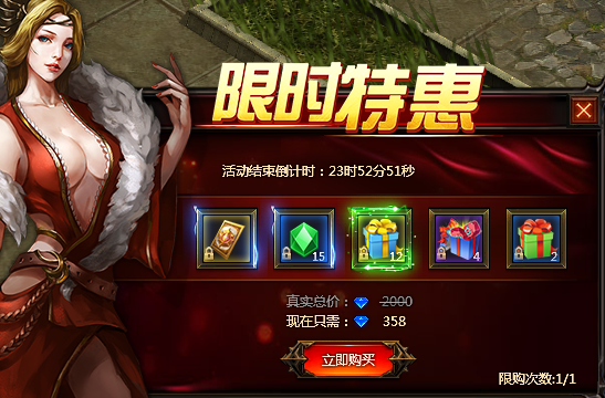 活动内容:活动时间内,玩家可在内查看每日购买内容,限时特惠每日仅可购买一次且仅限当日购买。机不可失,赶快来购买吧!