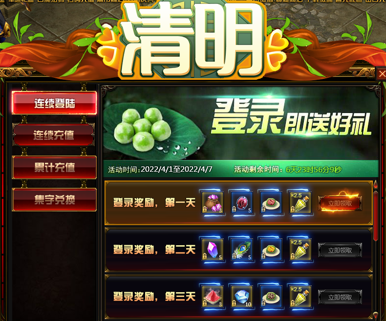 活动内容:活动时间内,玩家每天登陆游戏即可获得丰厚奖励。