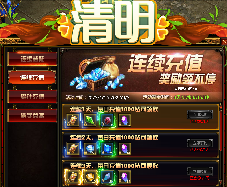 4.每日累计充值仅当日有效,第二日会进行清空