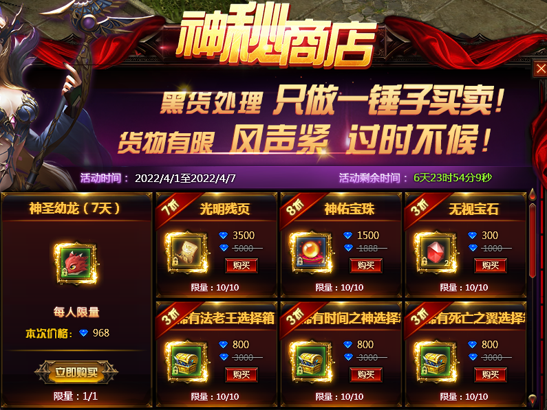 活动内容:神秘商品限时折扣,货物稀有,难得一见,快来选购吧。