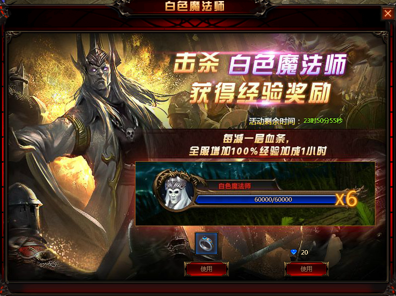 奖励3.每消减白色魔法师一层血条,全服增加100%经验加成1小时。