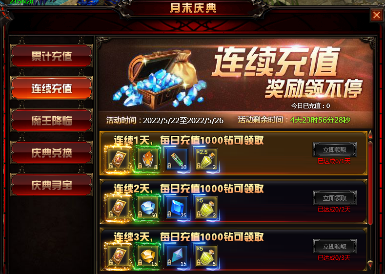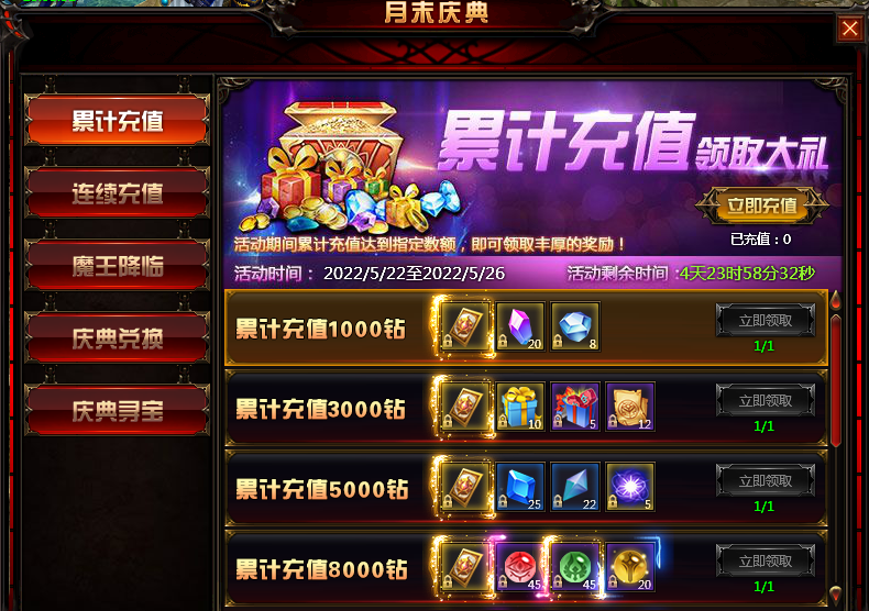 活动内容:玩家在活动时间内,累计充值达到一定钻石即可获得丰厚礼品,超值奖励等你来拿!