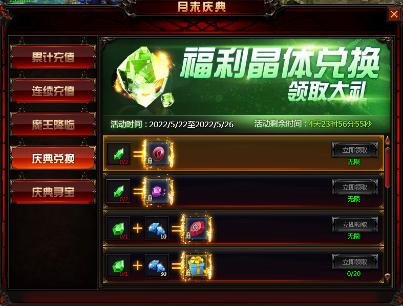 活动内容:玩家在日常挂机击杀小怪可获得小晶体,击杀野外BOSS、黄金BOSS、参与魔王降临活动可获得中晶体,使用不同晶体及钻石比例可兑换游戏中稀有道具,详情请根据游戏中活动兑换页面为准。
