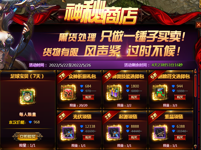 活动内容:神秘商品限时折扣,货物稀有,难得一见,快来选购吧。