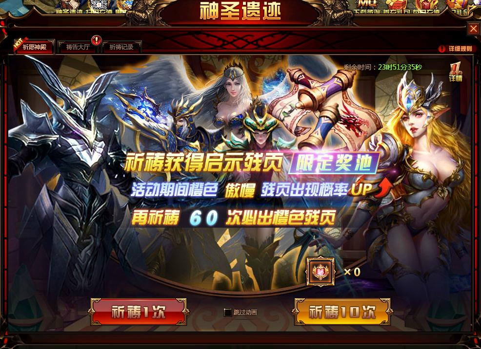 1.活动内容:祈愿神殿是神圣遗迹限时开启的一种特殊奖池,祈愿神殿中特定橙色残页获得的概率会极大的提升