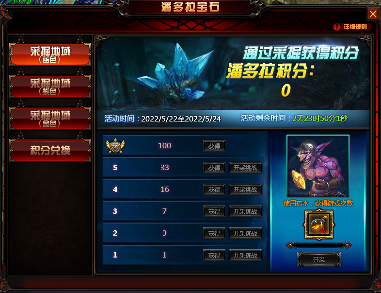 活动内容:活动期间,玩家需要根据采掘区域品质的不同来使用探宝药水或钻石进行开采,开采成功后可以直接获得积分也可以继续向上层开采,开采的层数越高失败的几率越大,失败后无法获得当前层数的积分
