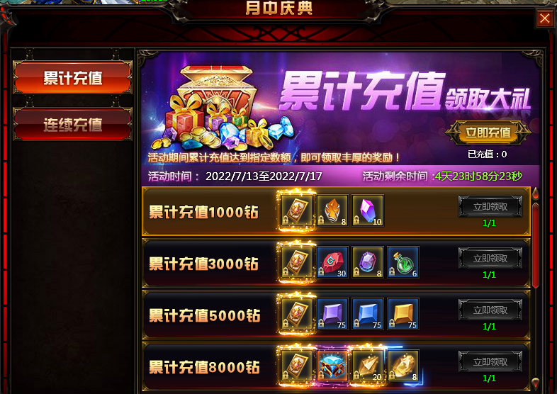 活动内容:活动时间内,玩家每日充值达到1000钻,即可获得丰厚奖励!