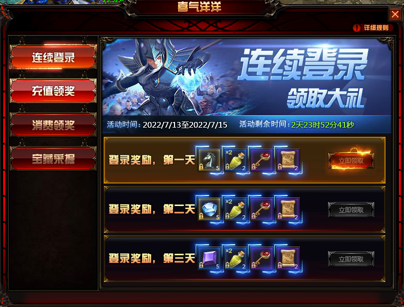 活动内容:玩家在活动时间内,可领取活动期间每日登陆可以获得1个“宝藏秘钥”,2张“更改券”。
