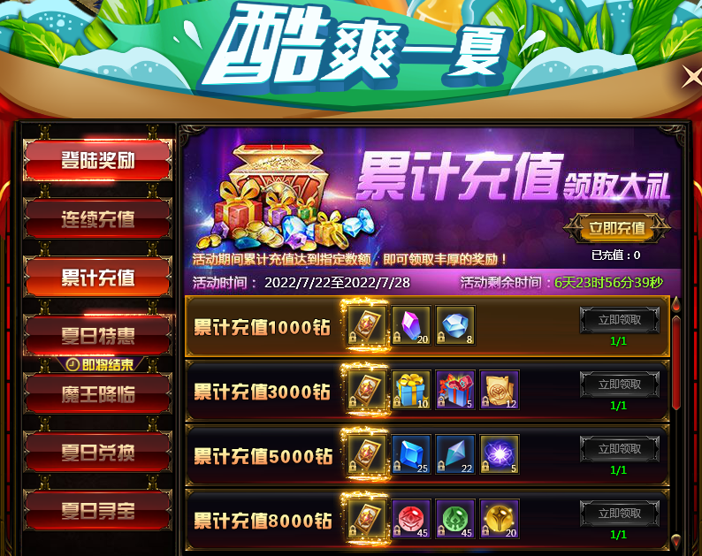 活动内容:玩家在活动时间内,累计充值达到一定钻石即可获得丰厚礼品,超值奖励等你来拿!