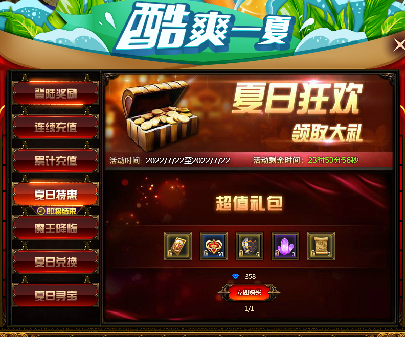 活动内容:活动时间内,玩家可在夏日特惠内查看每日购买内容,夏日特惠每日仅可购买一次且仅限当日购买。机不可失,赶快来购买吧。