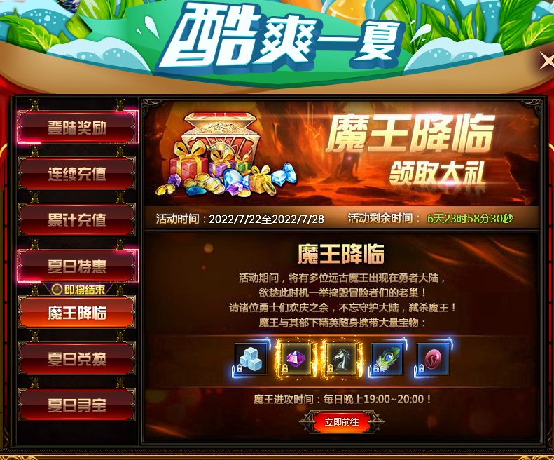 活动内容:活动时间内,每天晚上19:00~20:00勇者大陆会刷新魔王BOSS,击杀BOSS后可获得大量稀有道具奖励。