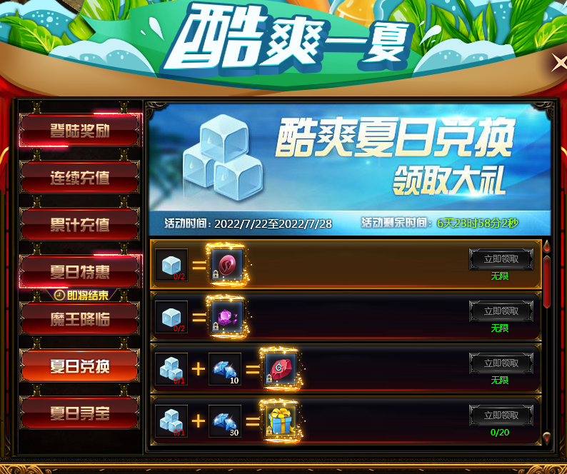 活动内容:玩家在日常挂机击杀小怪可获得小冰块,击杀野外BOSS、黄金BOSS、参与魔王降临活动可获得中冰块,使用不同冰块及钻石比例可兑换游戏中稀有道具,详情请根据游戏中活动兑换页面为准。