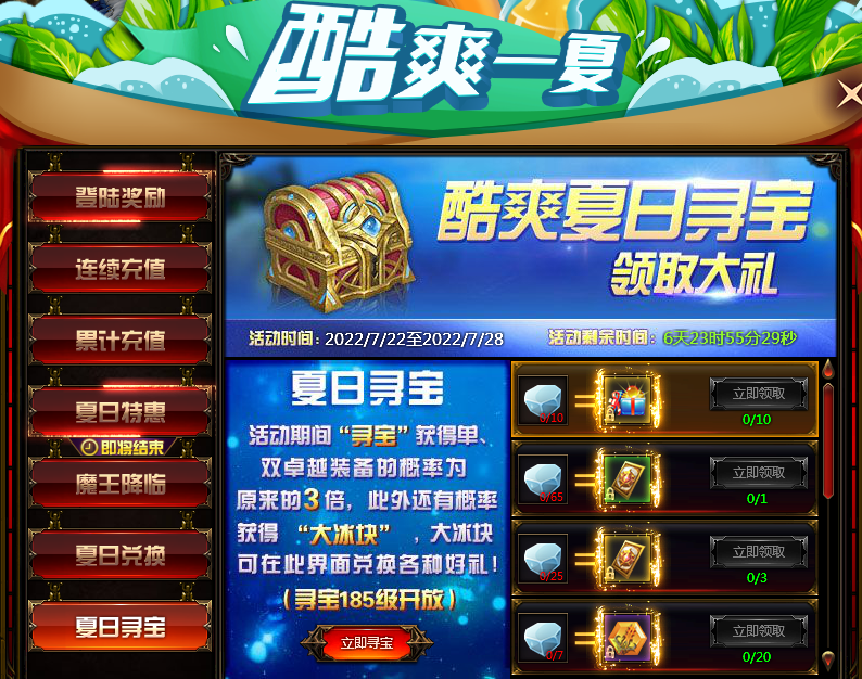 活动内容:玩家在寻宝中有概率可获得大冰块,使用大冰块可兑换游戏中稀有道具,详情请根据游戏中活动兑换页面为准。