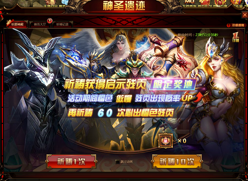 1.祈愿神殿是神圣遗迹限时开启的一种特殊奖池,祈愿神殿中特定橙色残页获得的概率会极大的提升