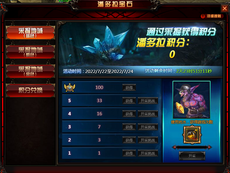 活动内容:活动期间,玩家需要根据采掘区域品质的不同来使用探宝药水或钻石进行开采,开采成功后可以直接获得积分也可以继续向上层开采,开采的层数越高失败的几率越大,失败后无法获得当前层数的积分