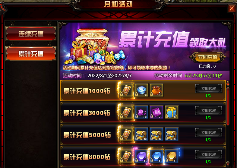 活动内容:玩家在活动时间内,累计充值达到一定钻石即可获得丰厚礼品!