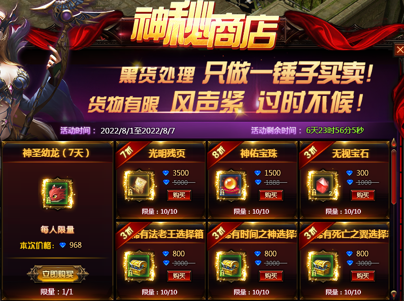 活动内容:神秘商品限时折扣,货物稀有,难得一见,快来选购吧。