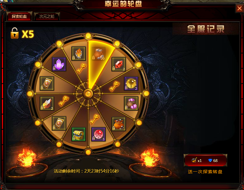 活动内容:玩家在活动时间内,使用68钻石可购买一次转盘机会,每获得5个次元要是可开启一分钟的次元之轮,次元之轮每次需要168钻石,奖励丰厚不容错过!