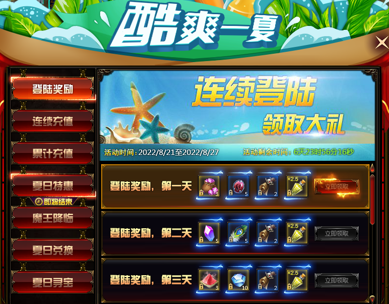 活动内容:活动时间内,玩家每天登陆游戏即可获得丰厚奖励。
