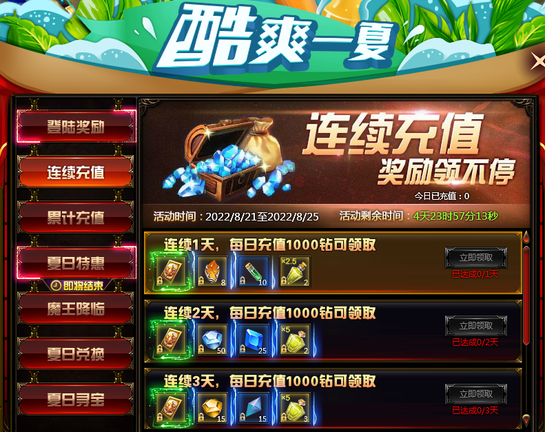 活动内容:活动时间内,玩家每日充值达到1000钻,即可获得丰厚奖励!
