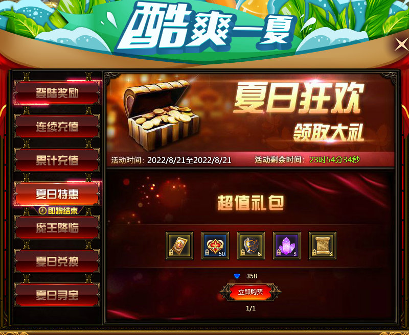 活动内容:活动时间内,玩家可在夏日特惠内查看每日购买内容,夏日特惠每日仅可购买一次且仅限当日购买。机不可失,赶快来购买吧。