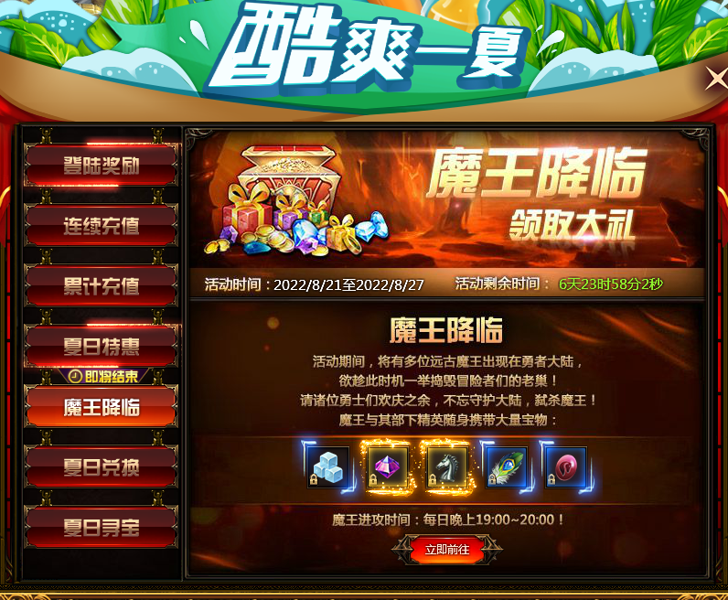 活动内容:活动时间内,每天晚上19:00~20:00勇者大陆会刷新魔王BOSS,击杀BOSS后可获得大量稀有道具奖励。