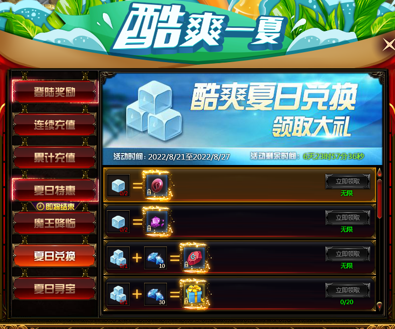 活动内容:玩家在日常挂机击杀小怪可获得小冰块,击杀野外BOSS、黄金BOSS、参与魔王降临活动可获得中冰块,使用不同冰块及钻石比例可兑换游戏中稀有道具,详情请根据游戏中活动兑换页面为准。