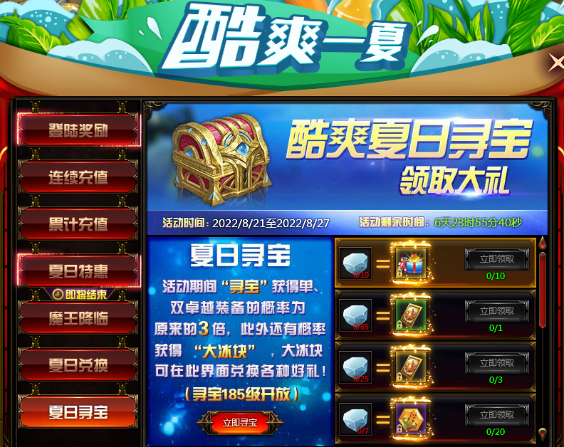 活动内容:玩家在寻宝中有概率可获得大冰块,使用大冰块可兑换游戏中稀有道具,详情请根据游戏中活动兑换页面为准。