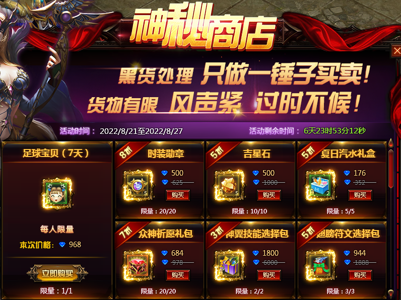 活动内容:神秘商品限时折扣,货物稀有,难得一见,快来选购吧。