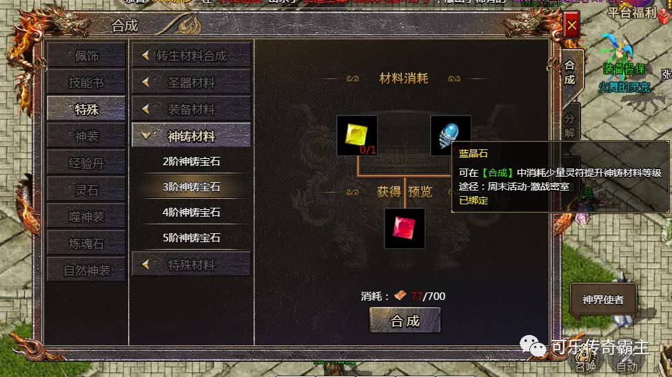 当我们收集足够的蓝晶石后,可进入到合成界面里的特殊道具合成,可以找到神铸材料的合成界面,去合成2阶或以上的神铸宝石的。合成需要消耗前一阶的神铸宝石、对应数量的蓝晶石、相应的灵符哦。