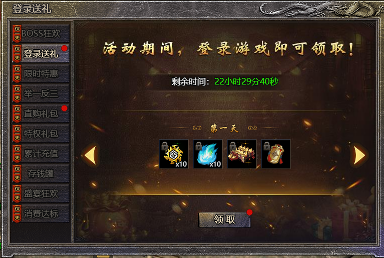 1.活动期间,玩家每天登录游戏,可以在活动界面中领取一份奖励;