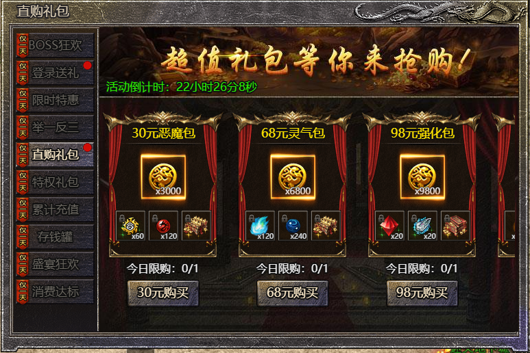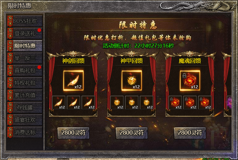 1.活动期间,玩家可在活动面板购买限购礼包,神剑特惠、神甲特惠、魔魂特惠、徽记特惠、经脉特惠、神阶特惠、荒古特惠、蛮王特惠