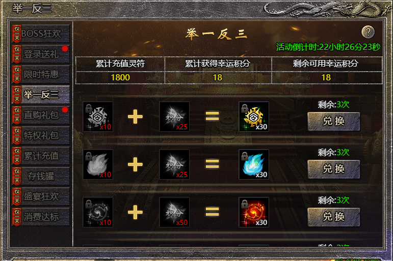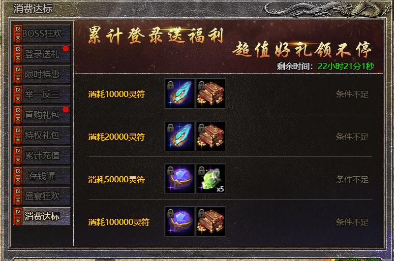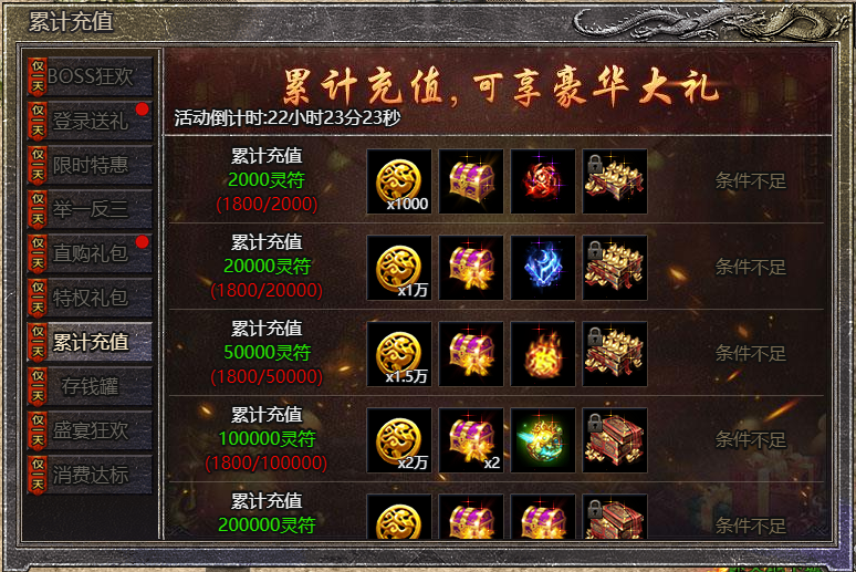 1.活动期间,每充值一定的灵符可领取一份奖励;